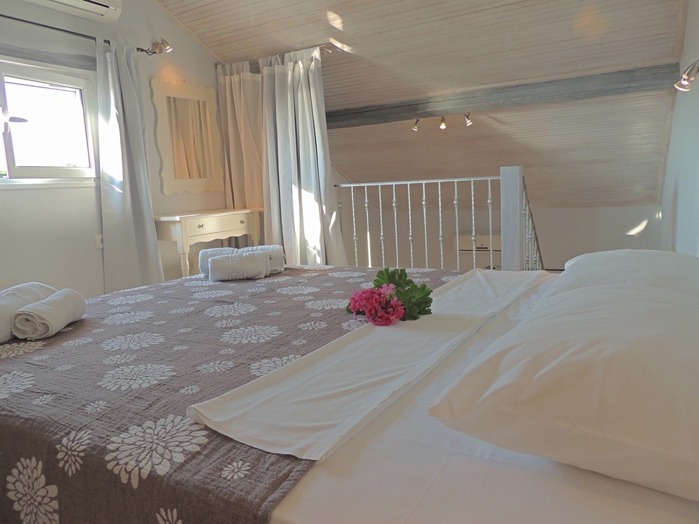 From the lower area left to the entrance door a staircase leads up to the sleeping loft. It is equipped with a double bed (2,00m x 1,60m), two bedside tables, a dressing table and a wardrobe. From this room the window offers a great view over Arillas to the sea and the cliff.