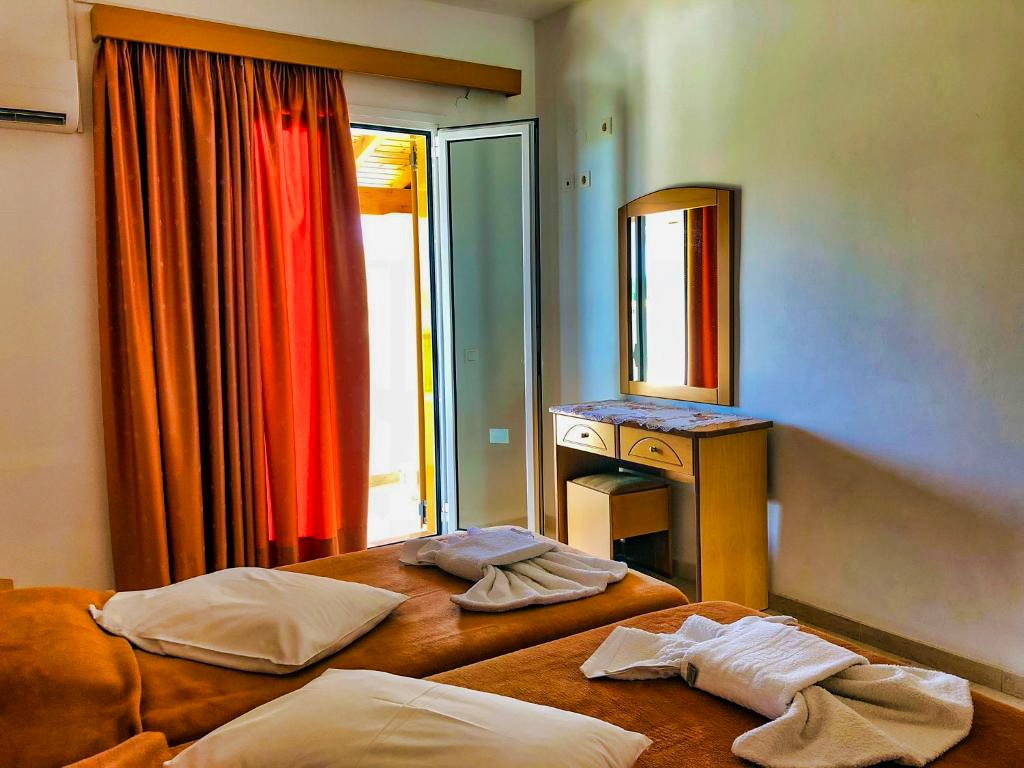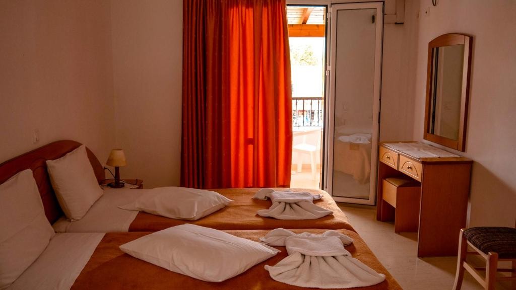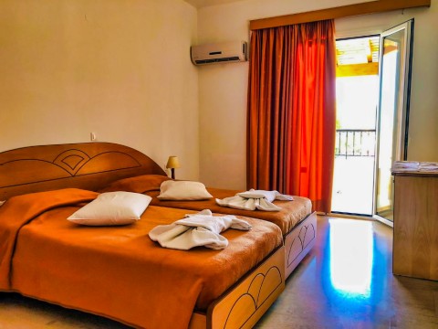 The studio features two single beds, a fully-equipped kitchen, and a bathroom with a shower. It also has a huge balcony for relaxing and enjoying the outdoors. Additional amenities include wifi, a safe deposit box, and air conditioning.