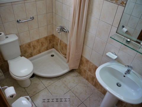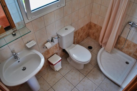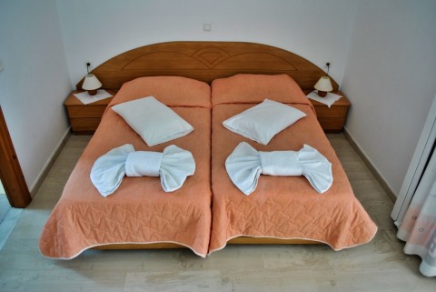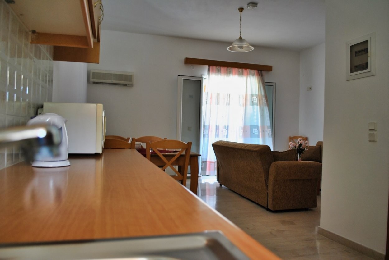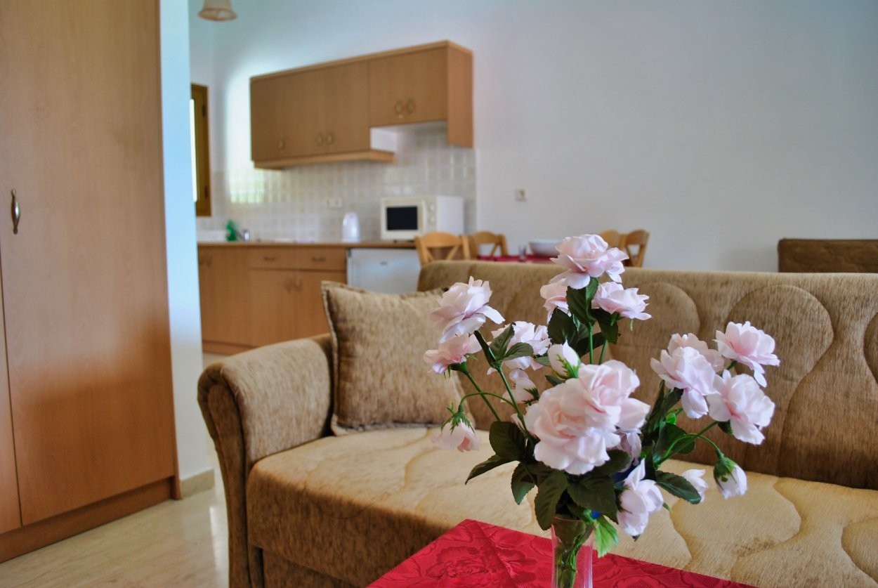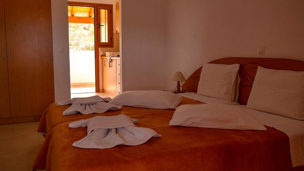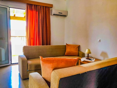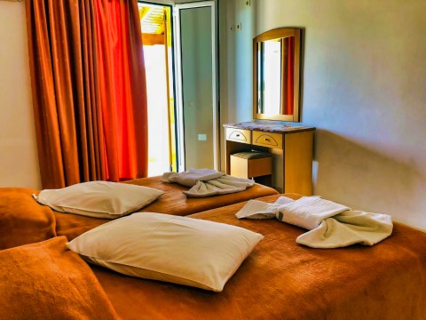 Our Premium One Bedroom Apartment is located on the top floor of the third building, offering beautiful views of the surrounding nature and olive trees. This spacious and modern apartment is situated in a peaceful and private setting, facing the resort's gardens. It features two single beds, a fully-equipped kitchen, and a bathroom with a shower.