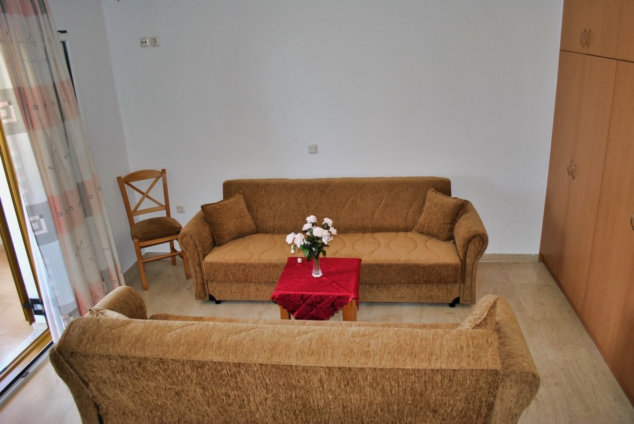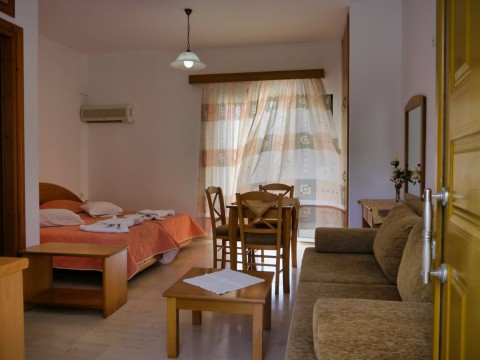 Our Premium Studio is a cozy and modern living space located on the ground floor of the third building. It offers beautiful views of the surrounding nature and olive trees and overlooks the resort's gardens.