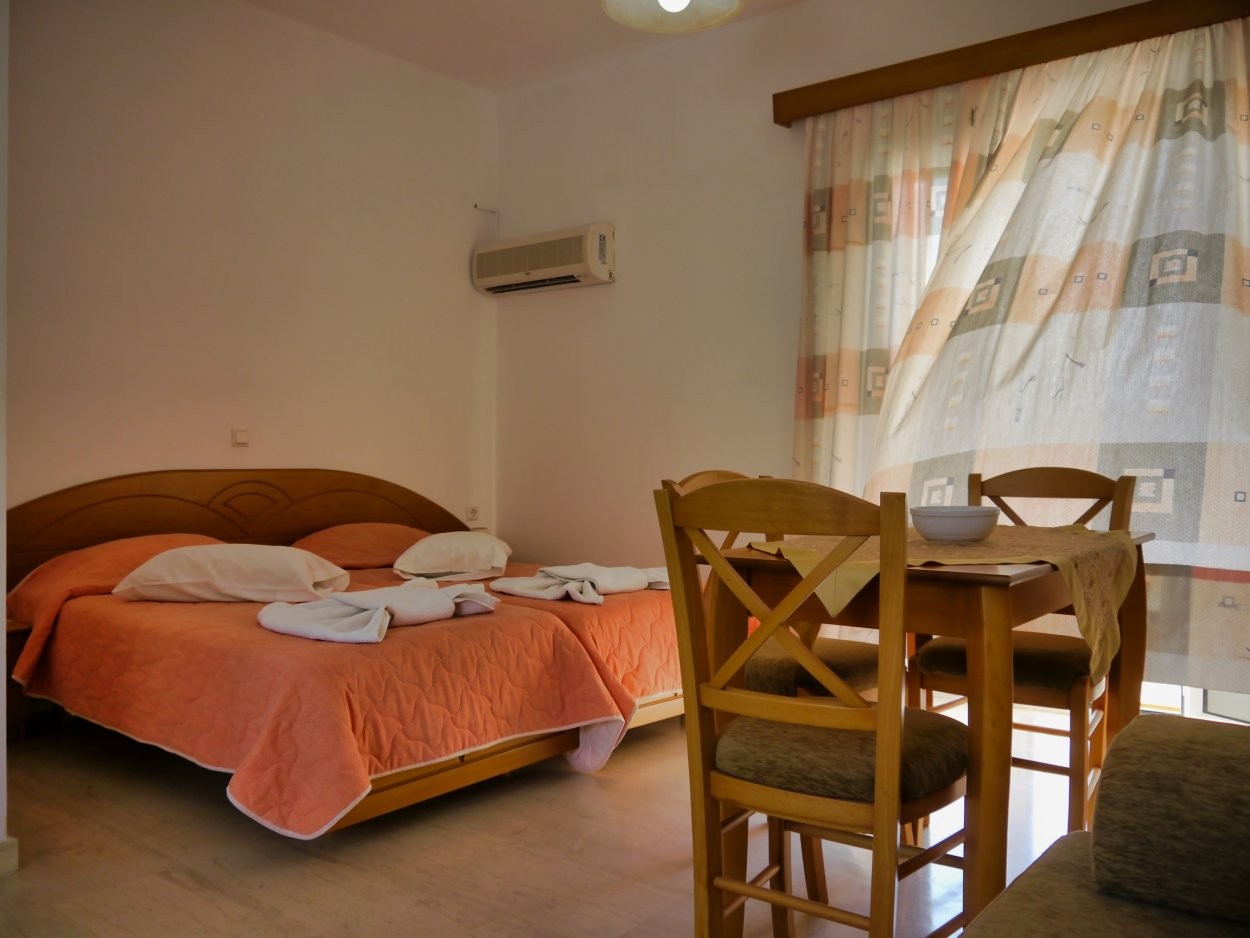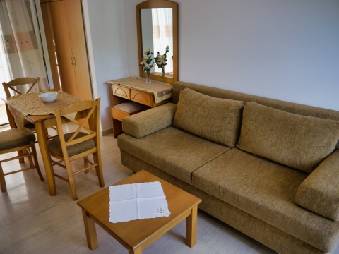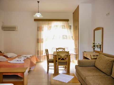 The studio features two single beds, a fully-equipped kitchen, and a bathroom with a shower. It also has a dining area and a living area with a sofa bed, as well as a huge balcony for relaxing and enjoying the outdoors. Additional amenities include wifi, a safe deposit box, and air conditioning.